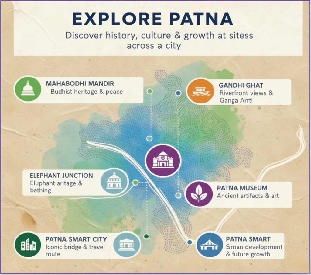 Key Landmarks: Golghar, Patna Sahib Gurudwara (Takht Sri Patna Sahib), Bihar Museum, Mahavir Mandir, and the Gandhi Maidan.